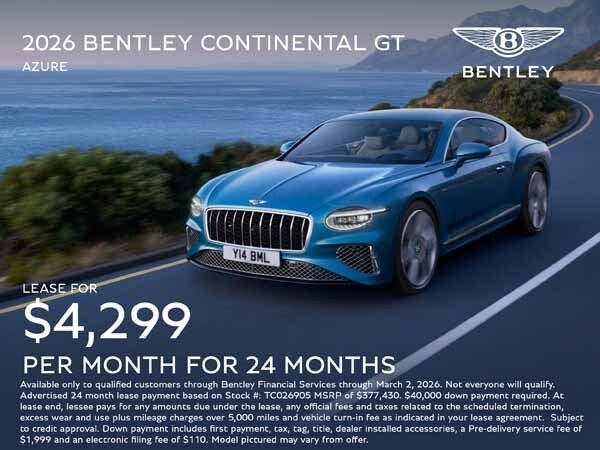 Available only to qualified customers through Bentley Financial Services through March 2, 2026. Not everyone will qualify. Advertised 24 month lease payment based on Stock #: TC026905 MSRP of $377,430. $40,000 down payment required. At lease end, lessee pays for any amounts due under the lease, any official fees and taxes related to the scheduled termination, excess wear and use plus mileage charges over 5,000 miles and vehicle turn-in fee as indicated in your lease agreement. Subject to credit approval. Down payment includes first payment, tax, tag, title, dealer installed accessories, a Pre-delivery service fee of $1,999 and an electronic filing fee of $110. Model pictured may vary from offer. Monthly lease payment excludes tax.